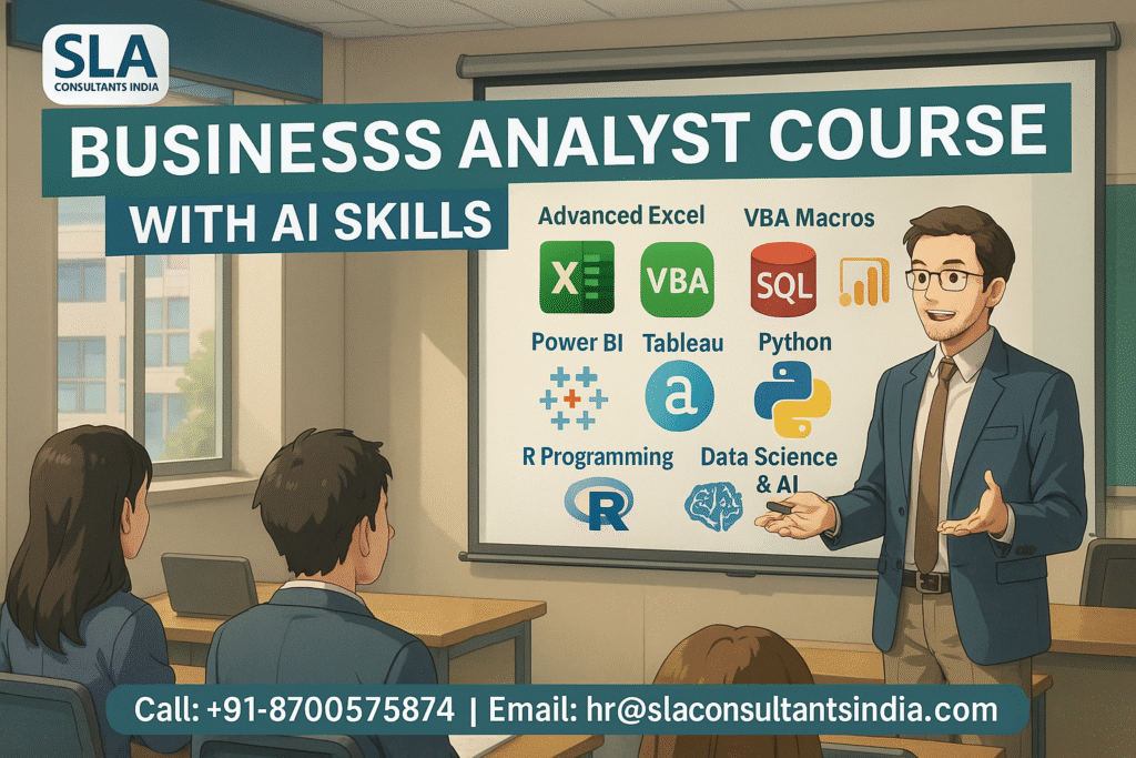 SLA Consultants India offers a government-recognized Business Analyst Course in Delhi, designed to equip learners with essential AI and business analytics skills, including Microsoft 365 Copilot certification, for the competitive job market of 2026. The course curriculum spans practical modules such as Advanced Excel with VBA/Macros, SQL, MS Access, Python, Power BI, Tableau, and R programming. Delivered by industry experts with over a decade of experience, this training includes live projects, case studies, and real-time assignments to prepare students for real-world analytics challenges in reputed multinational companies.